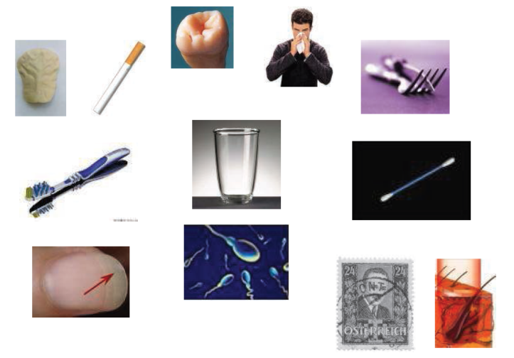Trinkglas mit Lippenabdruck, gerauchte Zigarette, Zahnbürste, Pfeife, Gebiß, etc.